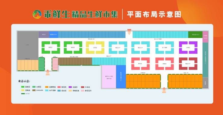 业态分布:进口水产海鲜;精品水产;综合加工区;蔬菜区;豆制品;光禽区;面发;粮油;调味品;鲜肉区;黑猪肉;精品牛羊肉;品牌熟食;卤味小吃;水果;花卉;早餐美食