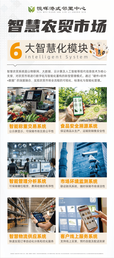 六、智慧农贸产品力——6大智慧化模块🖌️以物联网、大数据、云计算、人工智能为技术核心,通过“硬件+软件+数据”深度融合,实现农贸市场全流程可视化、标准化、智能化管理。• 智能称重交易系统:配备公示屏实时显示交易数据,保障交易公平性,消除传统农贸“缺斤少两”痛点。• 食品安全溯源系统:对生鲜商品从“田间到餐桌”全链路溯源,消费者可通过扫码查询产地、检测报告等信息,彻底解决食品安全顾虑。• 智能管理分析系统:对摊位租赁、费用收缴、商户考核等环节数字化管理,大幅提升市场运营效率,降低管理成本。• 市场环境监测系统:联动新风、排污系统,实时监测温湿度、空气质量,打造“无异味、无积水、无脏乱”的星级购物环境。• 智慧物流供应系统:整合上游农产品基地与物流资源,实现订单自动化分拣、冷链配送,保障生鲜商品“新鲜度”与“时效性”。• 客户线上服务系统:支持线上下单、预约自提、配送到家,适配“懒人经济”与数字化消费趋势,拓宽消费场景。