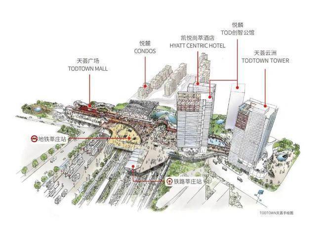 TODTOWN MALL天荟广场、超甲级写字楼TODTOWN TOWER天荟云洲、凯悦尚萃酒店、秘境大宅悦麓、无墙美术馆TODTIME时间廊与创智公馆TODTOWN天荟|悦麟,全维业态于此交织,实现 “下楼即享繁华,上楼自在领地”, 物质繁华与精神丰盈共生共荣的理想之境。