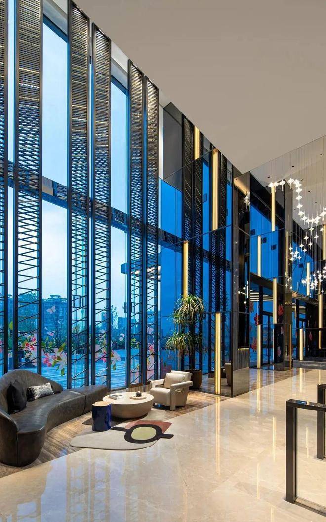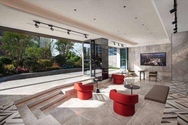 约9米超高挑空大堂:会客休息区分立礼宾台两侧,艺术作品萦绕四周,使每个置身于此的人都能拥有酒店级的尊贵感受;公区集合多位艺术家为TODTOWN天荟|悦麟度身创作的多维艺术品,包括 环境音乐、环境香氛、雕塑、油画等,前卫的设计感和高品质的呈现力,营造出多重感官享受的艺术享受。