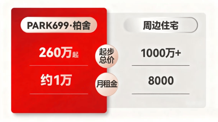 在陆家嘴千万级豪宅林立的市场中,PARK699·柏舍以总价260万起的精准定位,打造出“轻资产投资范本”。与周边品质二手房的价格相比,PARK699总价260万起的价格,相当于6折购入陆家嘴核心资产!同时,50年产权不限购的特性,让更多投资者获得了陆家嘴资产的入场券。