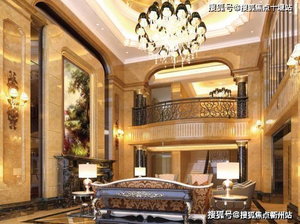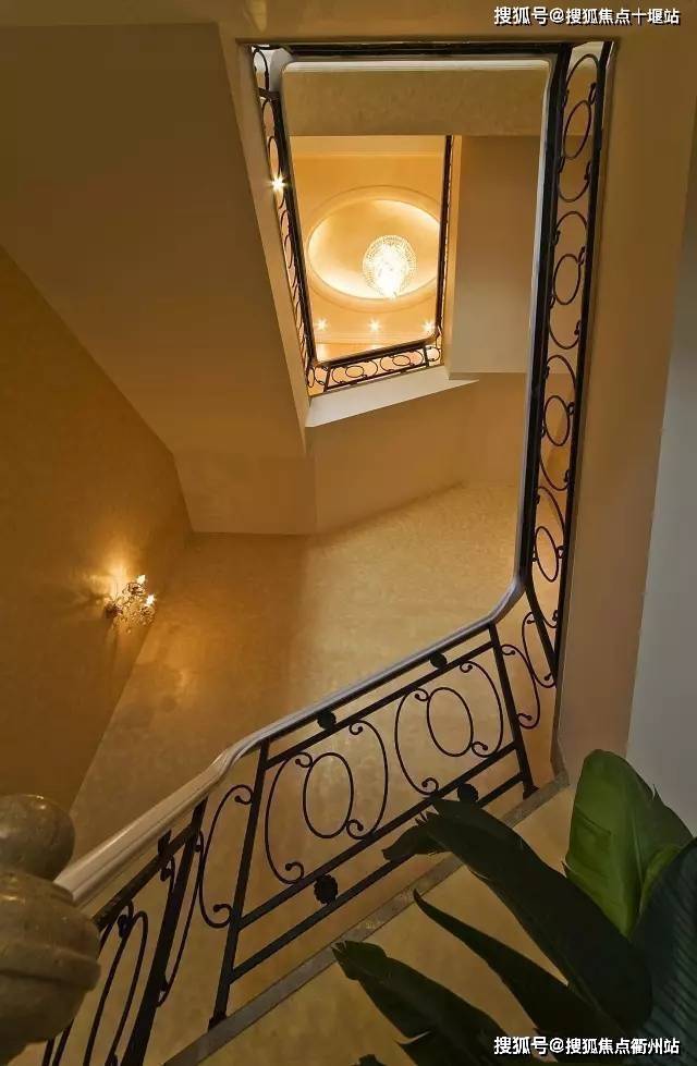 楼梯采用顺时针螺旋设计,寓意顺气,暗含财运事业平步青云,楼梯顶部为屋顶挑高艺术穹顶,可悬挂大型吊灯,气派华丽。