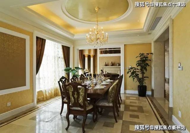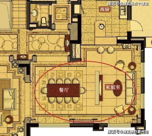餐厅位于客厅东侧,处东南方位,双面采光,是太阳升起最早照射的地方,也是风水吉位,给人以勃勃生机之感。整个区域面积约45平,面宽约8.6米,进深5米,配20人圆形餐桌仍显阔绰,与其相连的是近20平的家庭休息室,可以放一组沙发配电视柜,在等待用餐时,亲朋或小孩可在此休息聊天。