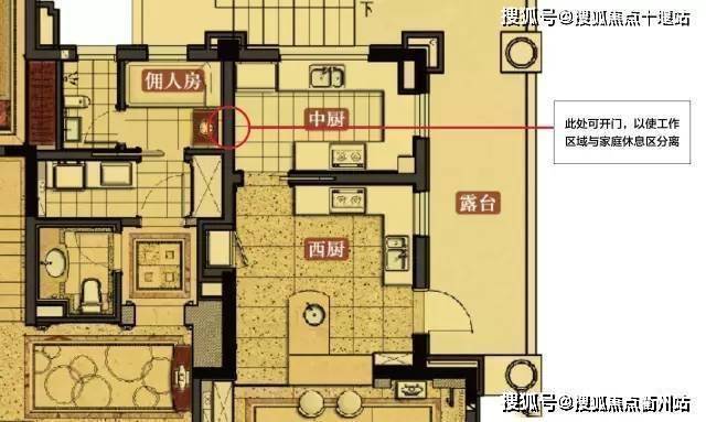 厨房,家庭室以北,总面积近25平,与15平的露台相连,保证了采光通风,并由隔墙分割成中厨和西厨,靠近家庭室的为西厨,无油烟。整体看,厨房区域位于整套房屋的东侧,东方属木,厨房属火,木生火旺,寓意主人红红火火。