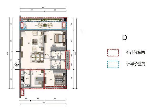 D户型 3房2厅2卫1厨 建面约91-99㎡