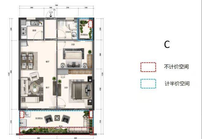 C户型 精致两居 双阳台设计建面约90-97㎡ 2房2厅1卫1厨格局方正,通透开间设计,功能空间分明人性化厨房设计,悦享烹饪时光餐厅客厅阳台相连一体,实用美观,便利大气次卧外接观景阳台,尊享生态人居生活约7.4m大阳台,悦享宽景生活,举目皆是无限风光