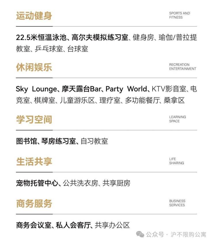 会所功能:上海罕有的尊崇会所配套!约3500平米使用面积,25大顶阶功能配套!22.5米恒温泳池、Sky Lounge、室内高尔夫模拟练习场等