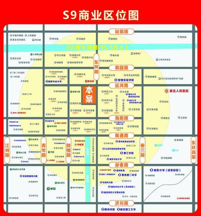 2.教育资源密集:城东幼儿园,扬桥小学,大浦小学,南师大泰州实验学校(原智堡学校)等优质学校环绕,学生文具、教育培训、餐饮休闲等业态需求庞大,消费频次高、黏性强。