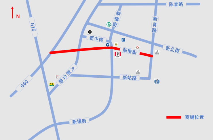 菜场:一个在新镇街新北街交汇处,一个在新北街新育路交汇处。