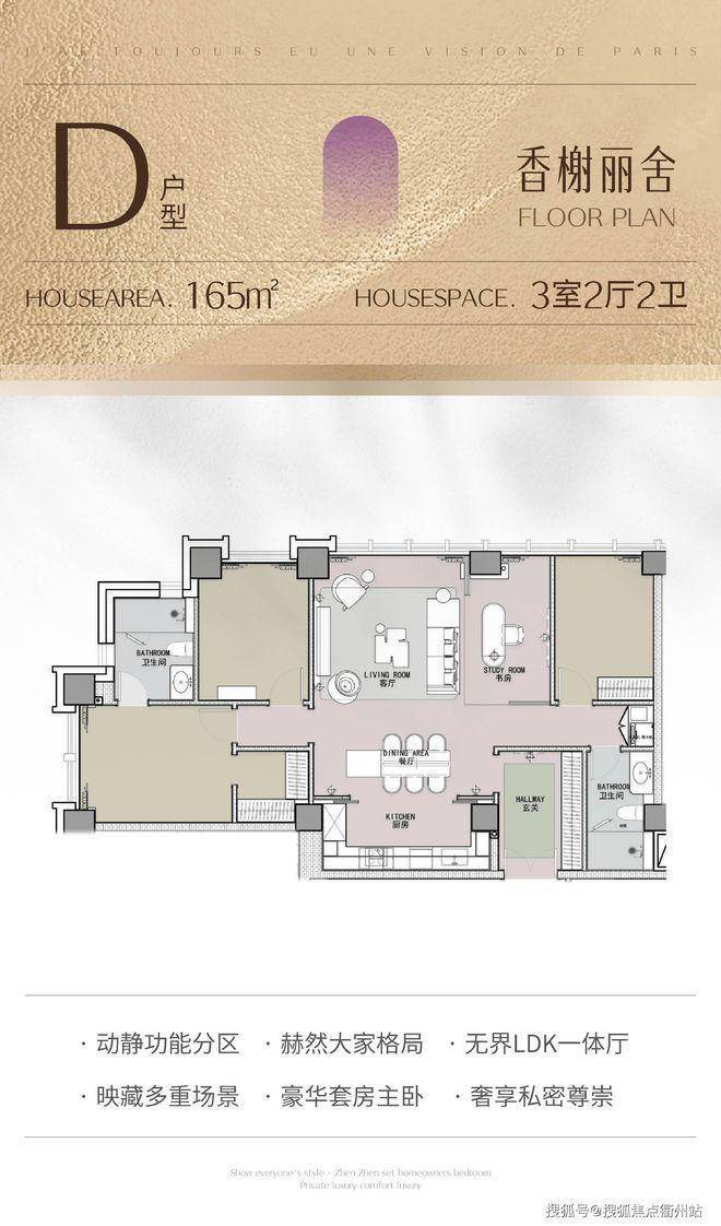 165㎡:3/3 + 1 房 2 厅 2 卫,设计灵感源自香榭丽舍和薰衣草庄园,空间更为宽敞,可灵活改造,适合改善型居住。