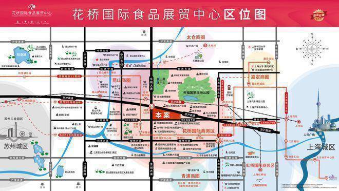 项目位于京沪高速和东城大道交汇处,交通便利,紧临沪宁高速陆家出口、312国道和地铁11号线,快速到达虹桥枢纽,昆山南站。项目建设目标为千亿级食品产业园,园区规划为全球食品展示交易基地,包括进口食品展贸区、国内地标食品展贸区、肉类、水产展贸区、优质果蔬展贸区、冷链仓储配套区、电子商务大楼、创意集市美食区、特色民宿配套区等。