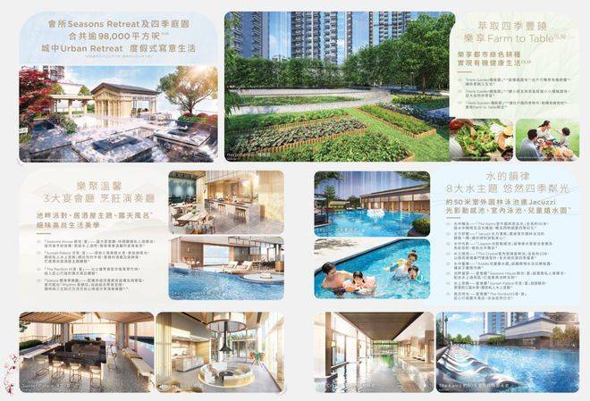 配套设施方面:项目设有面积约47,278平方呎的多层式住客会所「Seasons Retreat」及占地约51,066平方呎四季庭园,提供包括八大主题的水上设施,当中包括约50米室外游泳池,儿童嬉水园等,以及健身室、美术室及四季水疗等设施。