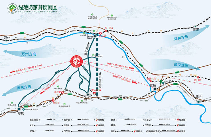 绿葱坡旅游度假区距县城48公里,宜巴高速、郑万高铁58公里,209国道、巴野公路贯穿,紧邻沪渝高速、沪蓉高速、神张高速(在建)。东至武汉,西往重庆,北至郑州、襄阳。距巴东站、建始高坪站、巴东北站3大高铁站均在1小时车程内。