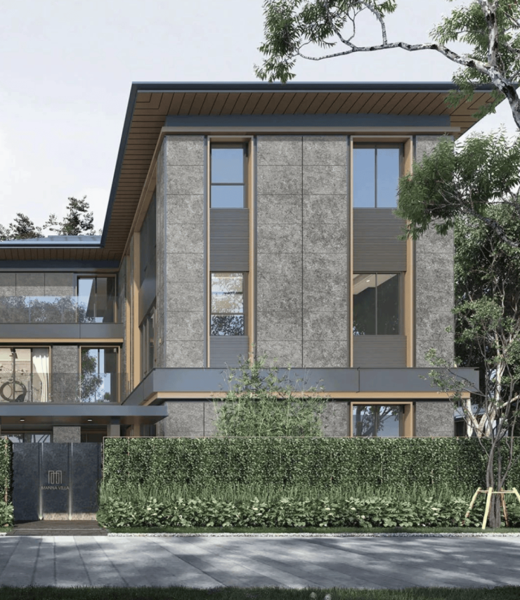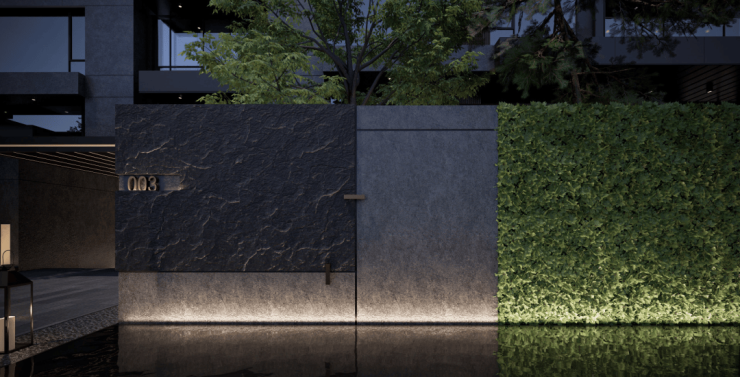 经典三段式别墅立面及大窗墙比,实现居住与自然的延伸;中灰色石材为基座,奢石宁静与土地矜贵互为映衬。