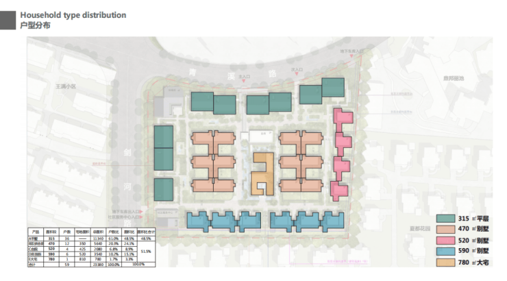 项目别墅是大头,且都是拼接型别墅:地上三层,地下一层,联排面积段为430㎡、530㎡、560㎡、700㎡,合计有23套。