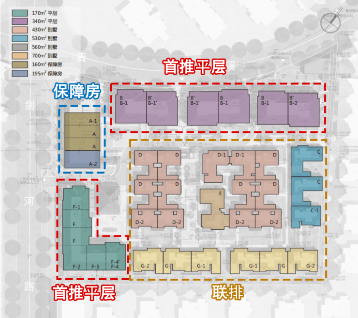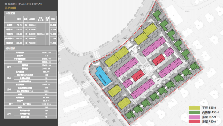 项目规划由5幢4层平层公寓、5幢3层联排别墅及1幢保障房组成。平层公寓面积段为134-350㎡、合计有45套;联排面积段为430㎡、530㎡、560㎡、700㎡,合计有23套。目前平层已售罄,剩余联排待售!