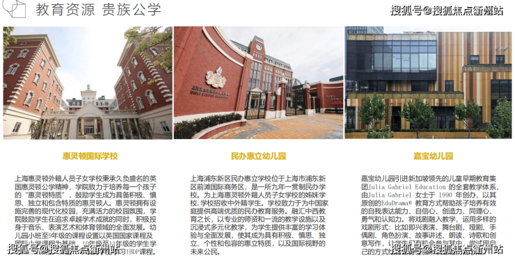 多所知名国际化私立学校,包括:嘉宝幼儿园、惠立学校、惠灵顿国际学校、协和双语。