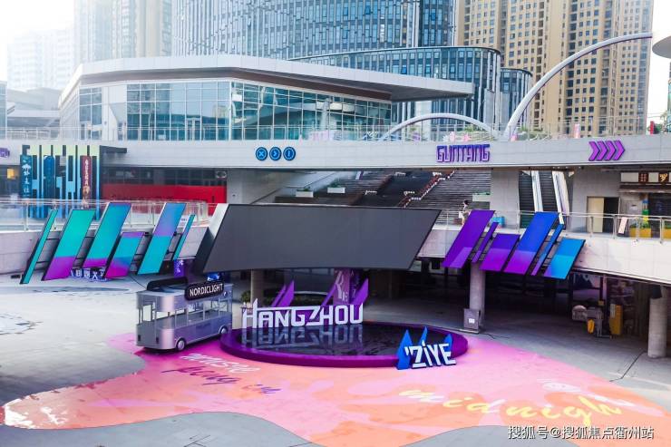 网红打卡:设置渊镜舞台、霓虹喷溅酒瓶装置、炫彩霓虹曲线等景观装置,满足网红打卡需求,必将成为萧山网红打卡新地标