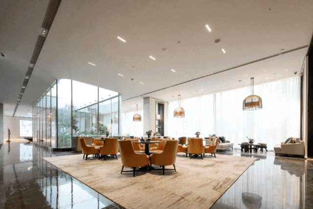 项目主入口仿照五星级酒店打造环岛式落客区,超48米星级酒店式迎宾门廊、约10米挑高归家大堂。